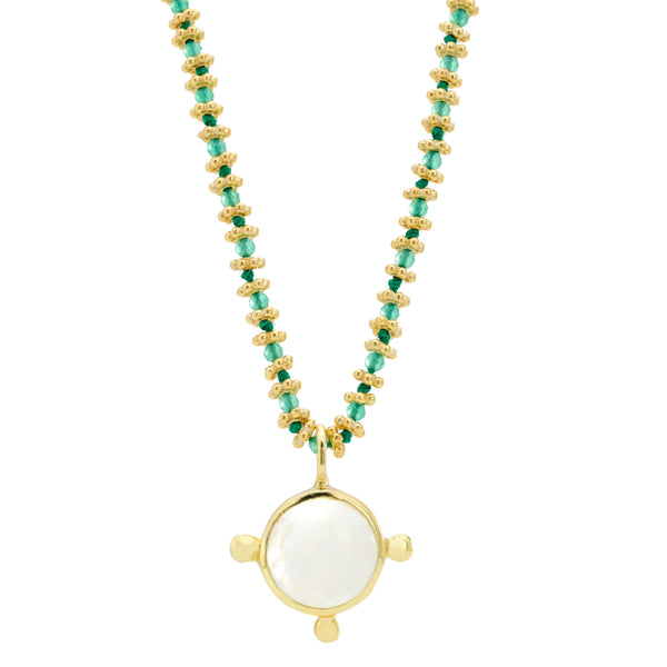 Designed in 18 ct gold-plated sterling silver, this necklace holds green onyx beside moonstone, creating a balance of form and emotion that feels both timeless and fresh — a symbol of grounding, strength, and resilience.