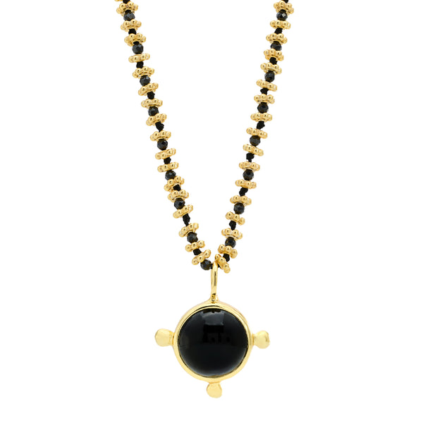 Crafted from 18 ct gold-plated sterling silver, the necklace features black onyx and black onyx, stones that shimmer softly and invite light into every moment — a stone of protection, confidence, and stability.